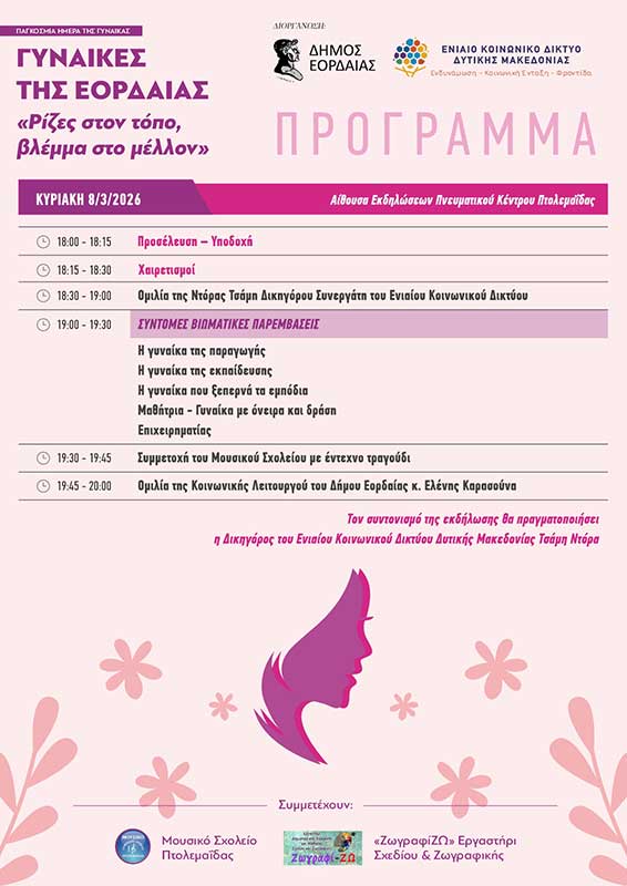 ΘΕΜΑ: Ο Δήμος Εορδαίας σε συνεργασία με το Ενιαίο Κοινωνικό Δίκτυο Δυτικής Μακεδονίας, με αφορμή την «Παγκόσμια Ημέρα της Γυναίκας» διοργανώνουν εκδήλωση με θέμα: