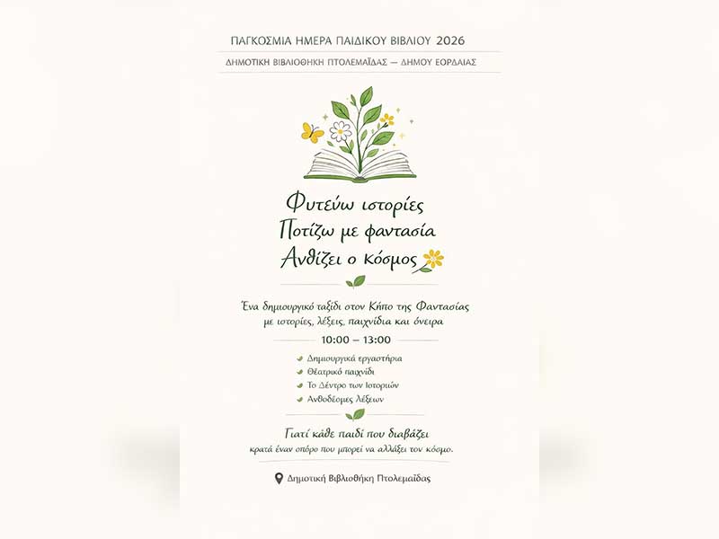 Με αφορμή την Παγκόσμια Ημέρα Παιδικού Βιβλίου, η Δημοτική Βιβλιοθήκη Πτολεμαΐδας ανοίγει τις πόρτες της και προσκαλεί τους μικρούς της φίλους σε ένα ξεχωριστό ταξίδι στον κόσμο της φαντασίας και των ιστοριών.