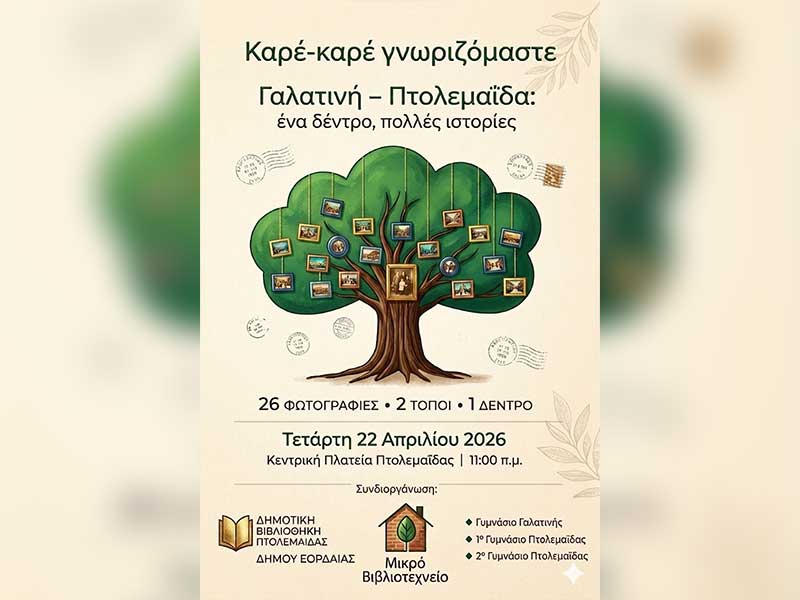 Η Δημοτική Βιβλιοθήκη Πτολεμαΐδας, το Γυμνάσιο Γαλατινής, το Μικρό Βιβλιοτεχνείο, το 1ο και το 2ο Γυμνάσιο Πτολεμαΐδας συνδιοργανώνουν την Τετάρτη 22 Απριλίου 2026 το πρόγραμμα φιλαναγνωσίας και πολιτιστικής ανταλλαγής με τίτλο: