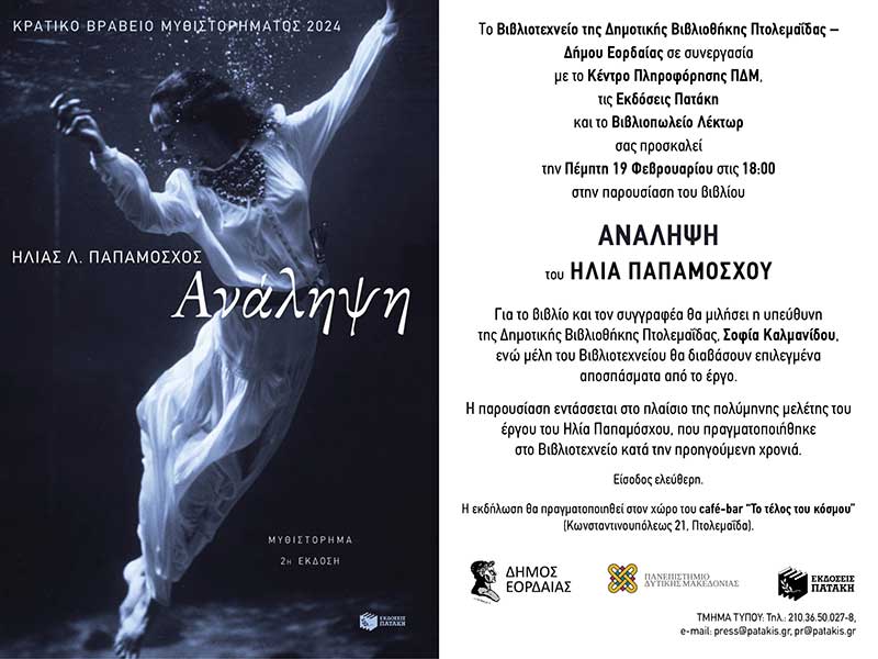 Το Βιβλιοτεχνείο της Δημοτικής Βιβλιοθήκης Πτολεμαΐδας – Δήμου Εορδαίας, σε συνεργασία με το Κέντρο Πληροφόρησης ΠΔΜ και τις Εκδόσεις Πατάκη, διοργανώνουν παρουσίαση του μυθιστορήματος Ανάληψη του Ηλία Παπαμόσχου.